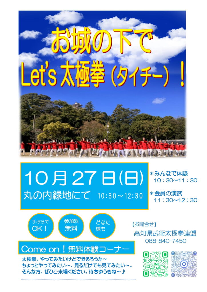 【開催のお知らせ】10/27 自然の中で太極拳in丸の内緑地 ☆☆10/27 自然の中で太極拳in丸の内緑地を開催します☆☆ 開催場所 : 高知市丸の内緑地 (高知市丸ノ内1丁目2) 開催日時 : 2024年10月27日(日) 午前10時30分~午後12時30分 午前10時30分~ みんなで体験 午後11時30分~ 会員による演舞 当日は10:30~11:30に太極拳を体験できる時間を設けております。 どなたでも体験できますので、太極拳に興味のある方はぜひご参加ください! 【問い合わせ先:高知県武術太極拳連盟 088-840-7450】 Share: Twitter Facebook Google+